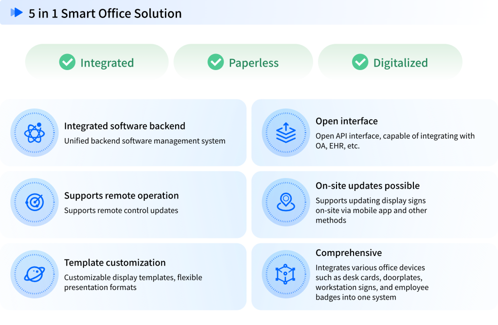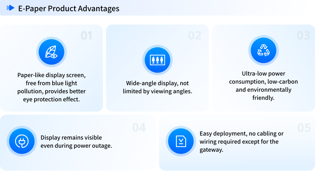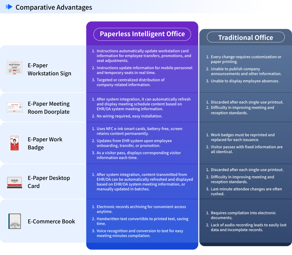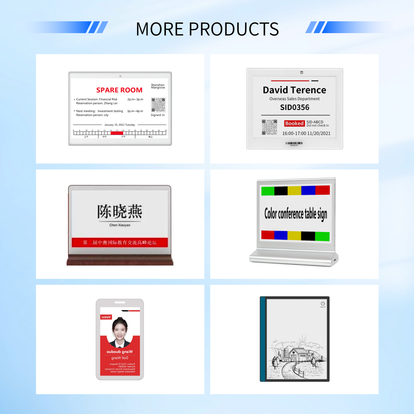 | Specifications | E-Paper Workstation Sign、E-Paper Meeting Room Doorplate、BWR E-Paper Desktop Card、E6 E-Paper Desk Nameplate、E-Book Reader |
